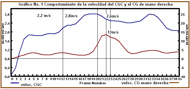 El gráfico 1 muestra el comportamiento de la velocidad resultante del centro de gravedad del cuerpo y del centro de gravedad de la mano que golpea durante las diferentes fases del movimiento.