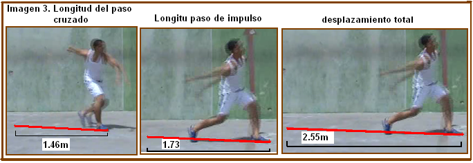 El pie de la pierna izquierda, durante el paso cruzado, se traslada 1.46m, sin embargo el desplazamiento durante el paso de impulso alcanza una longitud de 1.73 m, se considera que el tiempo de duración del mismo se haya prolongado, pues es la fase donde el atleta acumula toda la energía necesaria para producir el contacto con la pelota. La longitud total de los pasos fue de 2.55m.