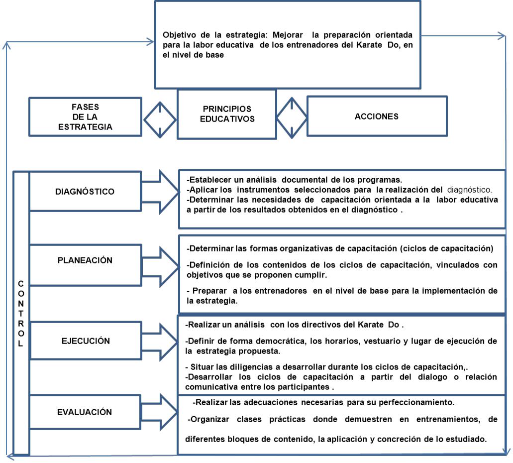 Para lograrlo se propusieron cuatro etapas que tienen como referente las acciones propuestas por De Armas (1999), que resultan ser las siguientes: Diagnóstico de la preparación orientada a la labor educativa de los entrenadores en el nivel de base, como segunda etapa la Planeación y organización de la estrategia en esta se definen metas u objetivos a corto, mediano y largo plazo que permiten la transformación del objeto desde su estado real hasta el estado deseado. La tercera etapa es la de Planificación se elaboran las acciones, recursos, medios y métodos que corresponden a estos objetivos. La etapa de Ejecución de la estrategia la cual tiene en cuenta los ciclos de gestión para la labor educativa utilizando como fundamento los veinte principios creados por Funakoshi (1938) y por último la etapa de Evaluación para determinar la aproximación lograda al estado deseado. Figura 1.